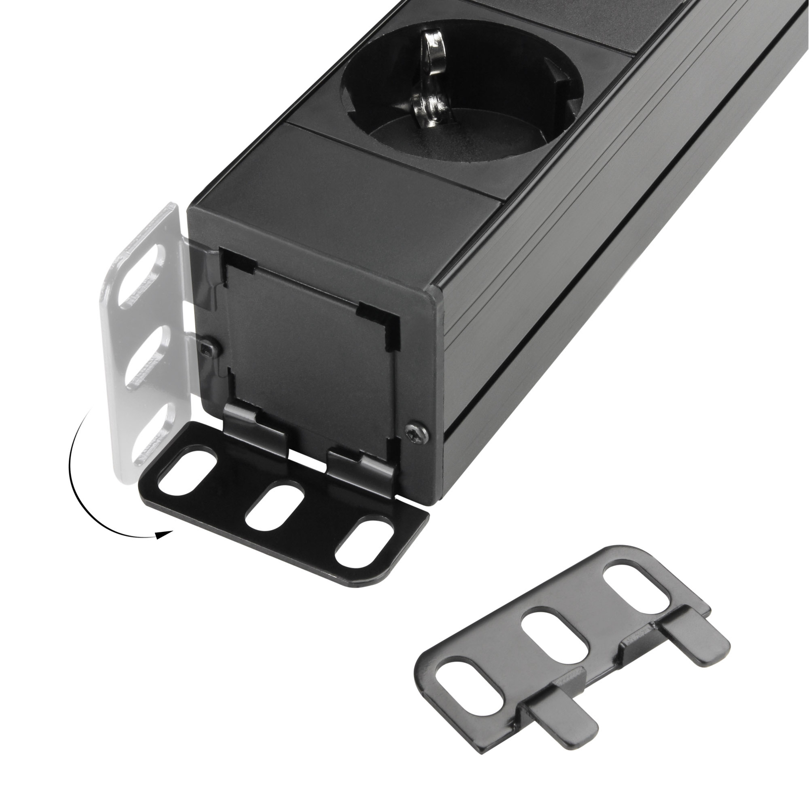 19" Stromverteiler 1HE 8-Fach mit SchalterDieser Stromverteiler für 19" Racks wurde entwickelt von unserer Adam Hall Cables® Crew in Deutschland, Die Rackwinkel sind in vier verschiedenen Positionen montierbar für hohe Flexibilität bei der Gestaltung des Racks. Die 8 Schukobuchsen sind 45° gedreht und der eingelassene, beleuchtete Schalter verhindert versehentliches Ein- / Ausschalten. Perfekt geeignet zur Festmontage im 19" Rack. Das Produkt kommt mit einem 1,8m PVC Kabel und gewinkeltem Schukostecker