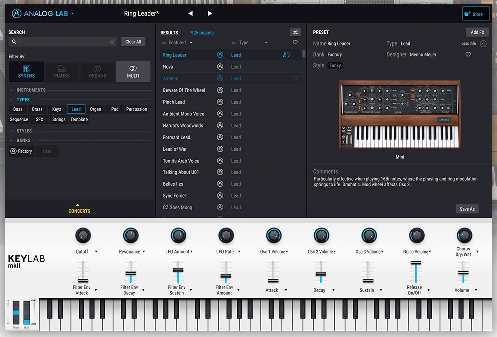 Als professionelles Hybrid-Instrument bietet das KeyLab Essential 88 das direkte Spielgefühl eines Hardware-Instruments, kombiniert mit der Flexibilität einer Software. Die Analog Lab 4 Software ist perfekt an das MIDI-Keyboard angepasst, wodurch sich Parameter wie Cutoff, Resonanz, Hüllkurven und vieles mehr direkt und intuitiv editieren lassen.