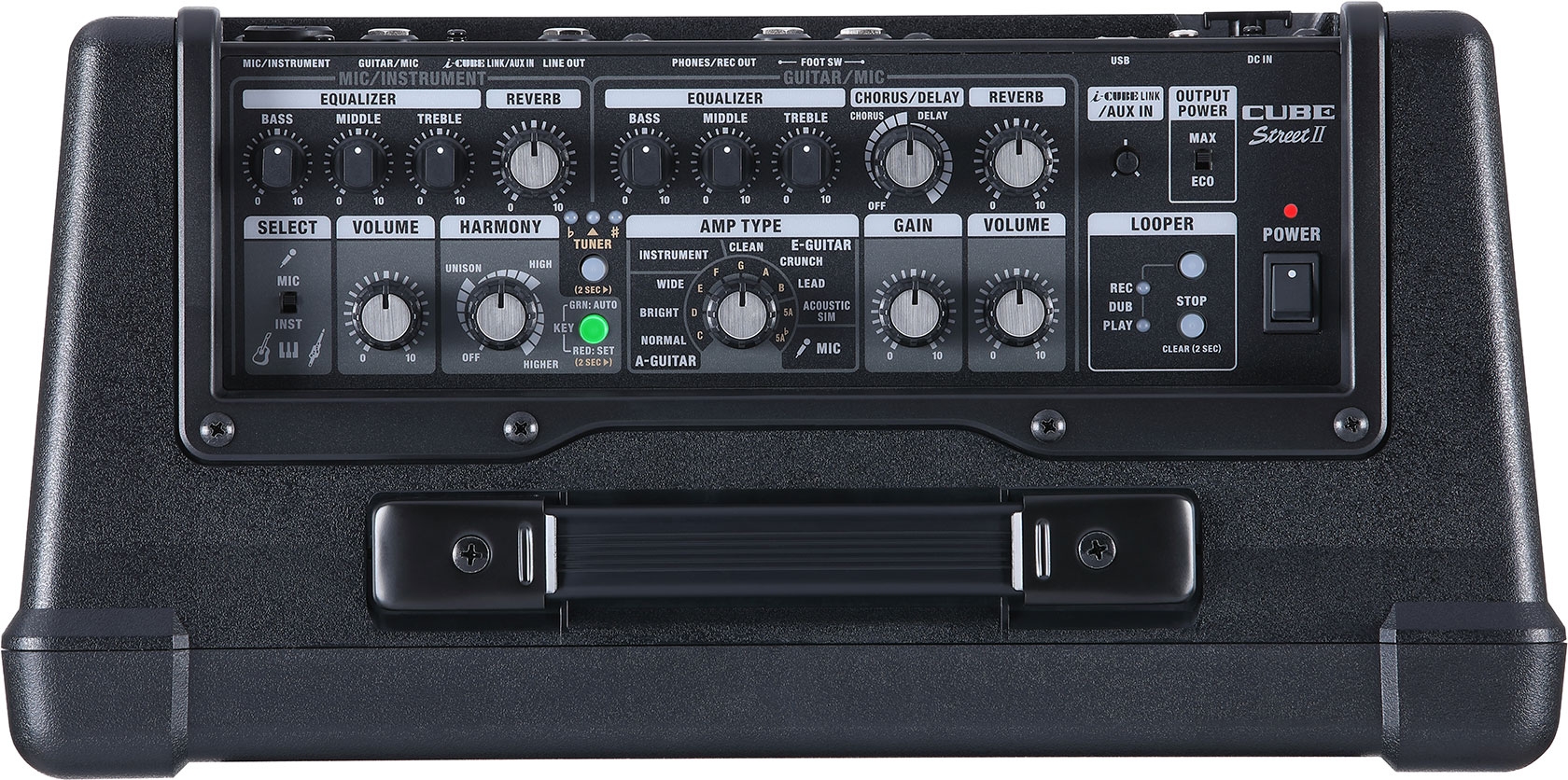 Mobiler Verstäker für akustische und elektrische GitarrenDer beliebte Boss Cube Street hat mit dem Cube Street II BLK einen würdigen Nachfolger gefunden. Die kleine Kiste hat alles an Bord, was ein Straßenmusiker braucht: Eingang für E-Gitarre mit 9 erstklassigen Amp Modelings, Eingang für Akustikgitarre oder Mikrofon (umschaltbar), intergrierte Effekte wie Hall, Delay, Chorus, Looper und ein automatischer Harmony Effekt für den Mikrofonkanal für perfekte Satzgesang Simulation. Ein cooles Feature ist ein Steckplatz für das optionale Boss BT-Dual Bluetooth Audio und MIDI Modul zum Streamen von Musik oder für Recording, Fernbedienung per Smartphone und drahtloses MIDI zur drahltlosen Koppelung MIDI fähiger Geräte. Der Cube Street II kann entweder per Netzteil (im Lieferumfang enthalten)oder mit 8 AA Batterien oder entsprechenden Akkus betrieben werden. Das Ganze in einem leichten aber sehr stabilen Kunststoffgehäuse im praktischen Floormonitor Design verpackt.