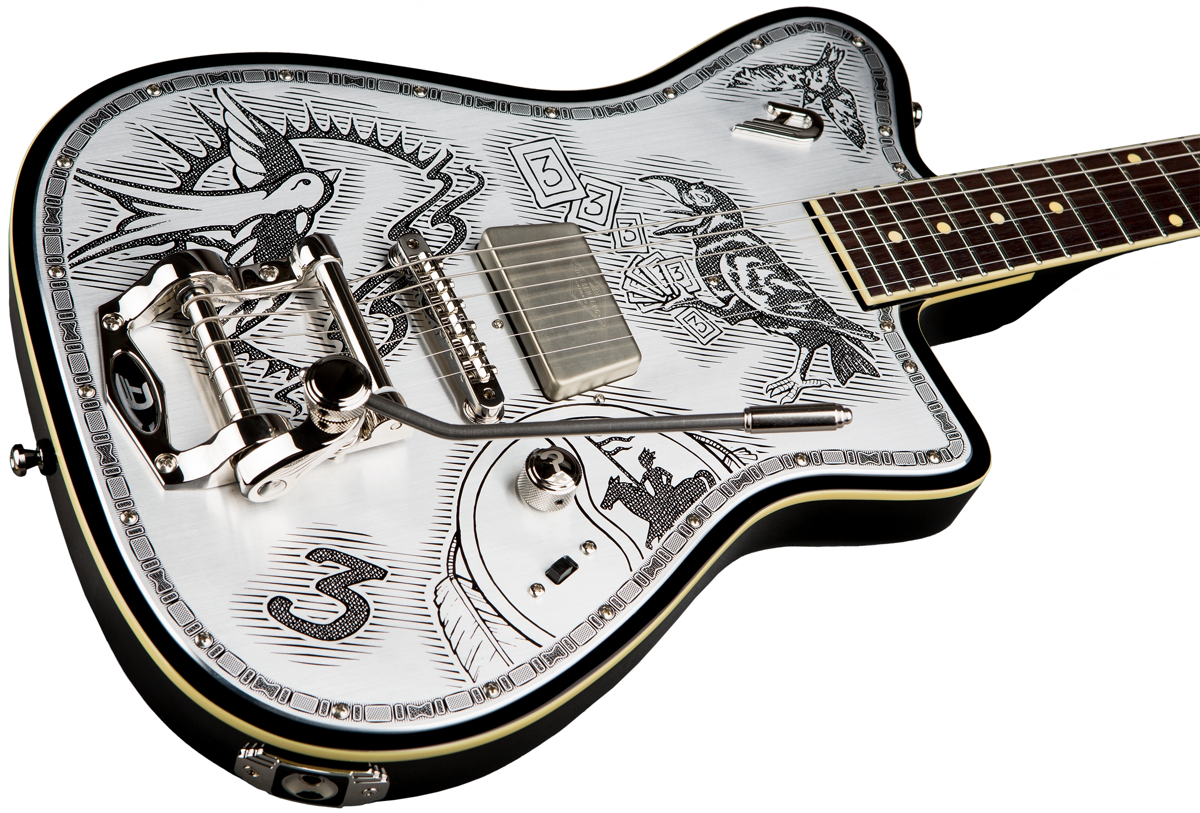 Solidbody E-Gitarre mit Sound-Kammern und Tremolo.Johnny Depp gehört zur Garde der angesagten Hollywood Schauspieler, die aber auch respektabele Musiker sind. Als Mitglied der Hollywood Vampires bedient er die Gitarre an der Seite von Alice Cooper, Joe Perry sowie diversen Gaststars. Duesenberg hat in Zusammenarbeit mit Johnny Depp eine coole Signature Gitarre kreiert. Die Duesenberg Alliance Johnny Depp ist sowohl optisch als auch von der Ausstattung ein echtes Highlight. Die Decke des mit Tonechambers versehenen Erlenbodys trägt ein graviertes Alu Pickup im Zemaitis Stil mit Johnny Depp Tattoo Artwork. Auch die Elektrik ist ungewöhnlich: ein kräftiger Duesenberg JD-63 tapped Single Coil sorgt für oderntlich Druck, bei Bedarf kann die Spulenanzapfung geschaltet werden, was einen cleanen Single Coil Sound ergibt. Mit an Bord ist das kutlige Tremolo Tremolo in Verbindung mit der Duesenberg Steel Saddle Bridge.