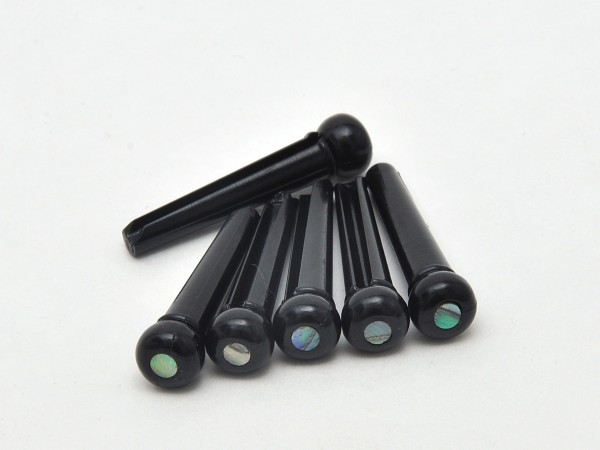 Pins zur Saitenbefestigung bei Westerngitarren, 6 StückBridge Pins aus Kunststoff stellen die Standard-Ausstattung der meisten Akustikgitarre dar. Sie sind nicht nur preiswert, sondern auch klanglich durchaus eine Alternative, wenn man die Ausgewogenheit seiner Gitarre nicht beeinflussen will. Mit edel aussehender, runder Abalone-Einlage im Kopf. Die Pins kommen als Komplett-Set zu 6 Stück.