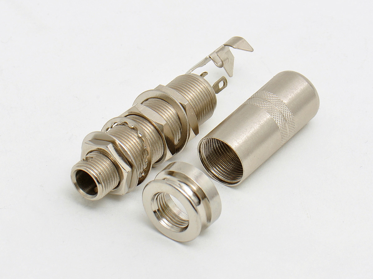 Für 6,3mm Klinke. Mit zusätzlichem Schaltkontakt und Abschirmhülse.Pertinax Isolierung. Die Befestigungsmutter dient gleichzeitig als Gurtpin.