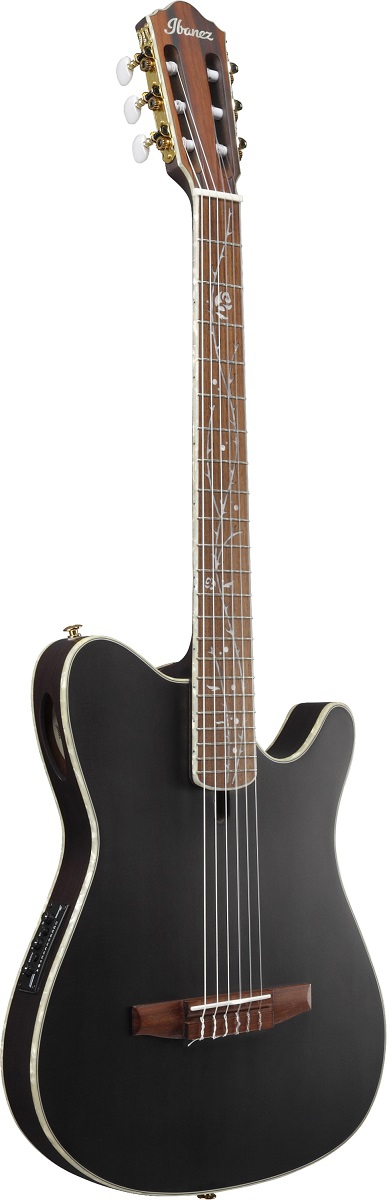Tim Henson Signature Klassikgitarre flacher BauartMit der TOD10N-TKF bekommt der Ausnahmegitarrist Tim Henson von Polyphia seine sehr interessante Signature-Gitarre mit Nylon-Saiten. Die Basis der Gitarre bildet ein modifizierter FR Hollowbody mit einer massiven Fichtendecke mit Fächer-Beleistung und einem Soundport in der Zarge. Die TOD10KN-TKF ist eine Thinline-Gitarre und mit ihrer Sattelbreite von 46 mm wie geschaffen für schnelle und präzise Läufe. Dennoch bietet die Gitarre genug Saitenabstand für Picking-Techniken und komplexe Fingersätze. Abgenommen wird sie von einem Fishman Sonicore Tonabnehmer mit Ibanez AEQ210TF Vorverstärker mit eingebautem Stimmgerät. Das optische Highlight bildet die sehr schöne „Tree of Death“-Griffbretteinlage. Mit diesen Features ist die TOD10N-TKF Tim Henson Signature der neue Maßstab für elektroakustische Gitarren mit Nylon-Saiten.