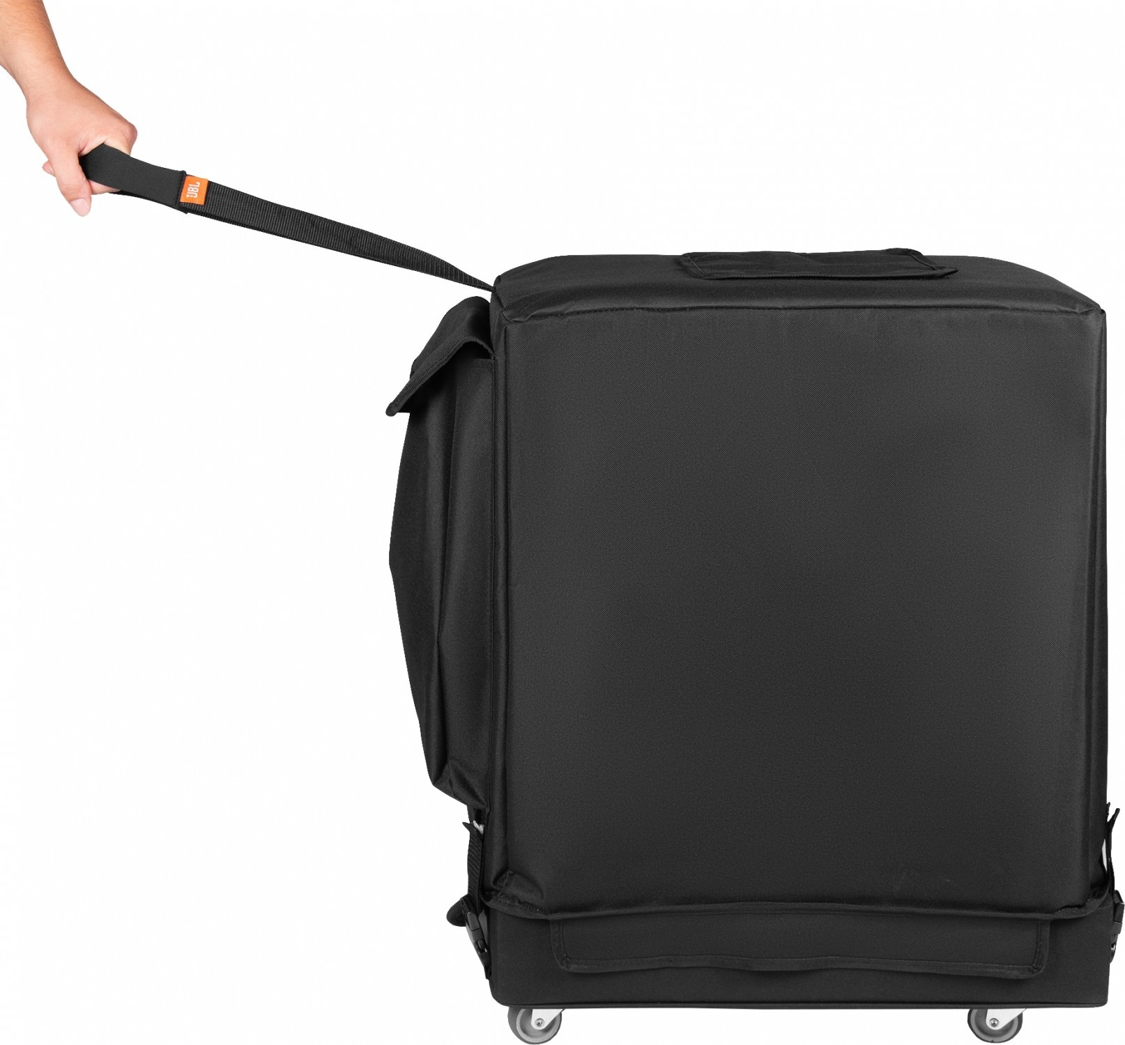 Set aus Rollbrett und Schutzhülle zum einfachen Transport der JBL EON ONE MK2. Die Schutzhülle besteht aus einem dicken, reißfesten Polyesterüberzug mit einer großen Außentasche zur Aufbewahrung von Kabeln und Zubehör.Das Rollbrett verfügt über eine Aussparung für den Tragegriff des Lautsprechers, mit dem das System im Transporter leicht angehoben und bewegt werden kann.