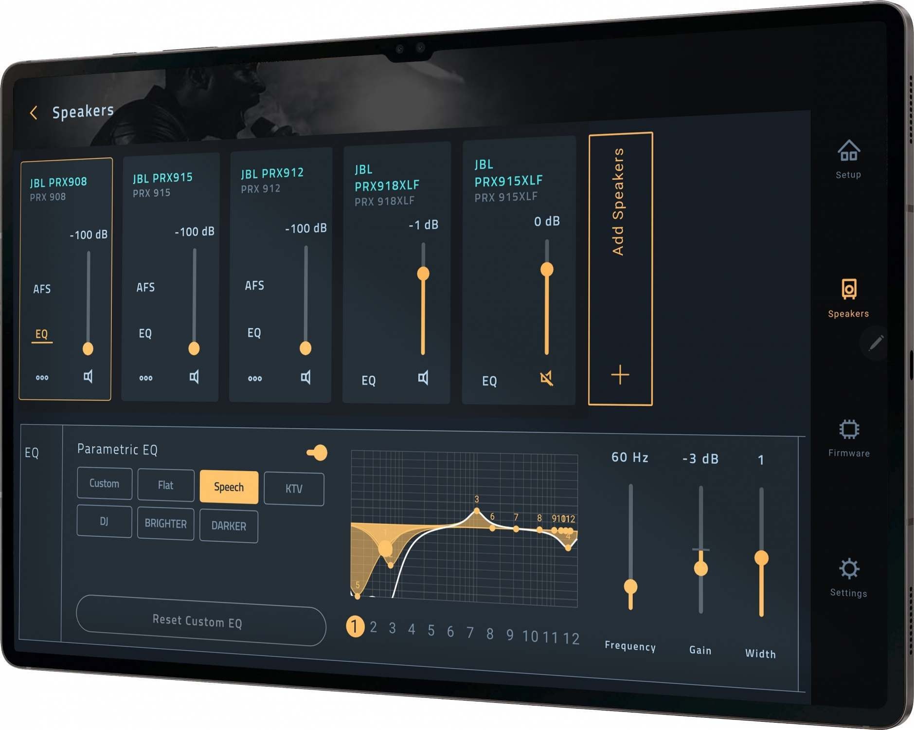 Die JBL Pro Connect-App bietet eine vollständige Hardware- und DSP-Steuerung von bis zu zehn Lautsprechern. Die Modelle der PRX900-Serie können in Projekte mit anderen JBL-Lautsprechern wie JBL EON ONE MK2, PRX ONE und EON700 integriert werden, wobei exklusive Funktionen wie Snapshots und das zusammenfassen in Gruppen bestehen.