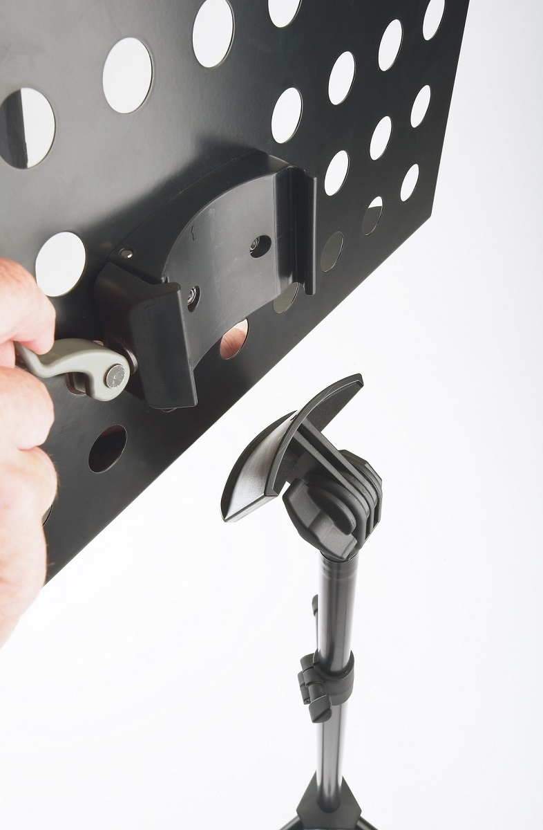 Pulverbeschichtetes gelochtes Notenpult aus Stahl mit Verbindungselementen aus Kunststoff. Die Notenpultplatte kann mit einem praktischen und bedienerfreundlichen Schnellverschluss einfach und schnell montiert und abgenommen werden. Eine große handliche Flügelmutter erleichtert das Fixieren der Schrägstellung. Die stufenlose Höhenverstellung erfolgt über eine oberflächenschonende Spannhülse.Anmelden