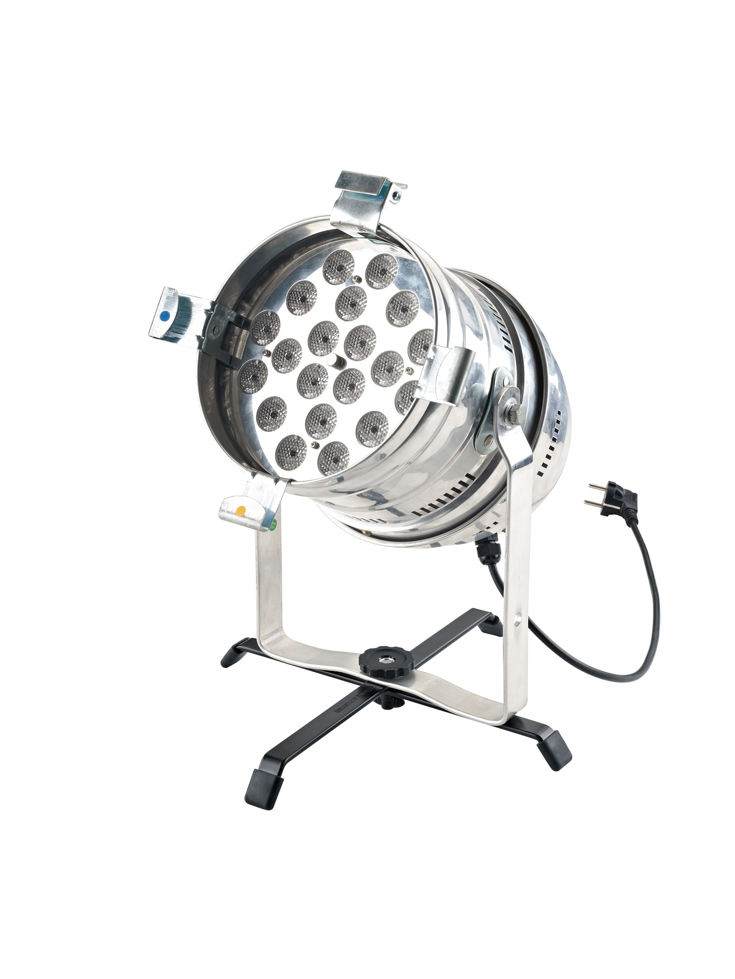 Der robuste Kreuzfuß garantiert einen stabilen Stand für Bodenscheinwerfer. Zum Transport lässt er sich im Handumdrehen flach und platzsparend zusammen klappen.Zusätzliches Werkzeug wird nicht benötigt. Die Endkappen aus Gummi verhindern ein Verkratzen des Bodens. Der Scheinwerfer mit Bügel wird einfach und schnell durch eine handliche Sterngriffmutter auf dem Gewindebolzen M10 befestigt.