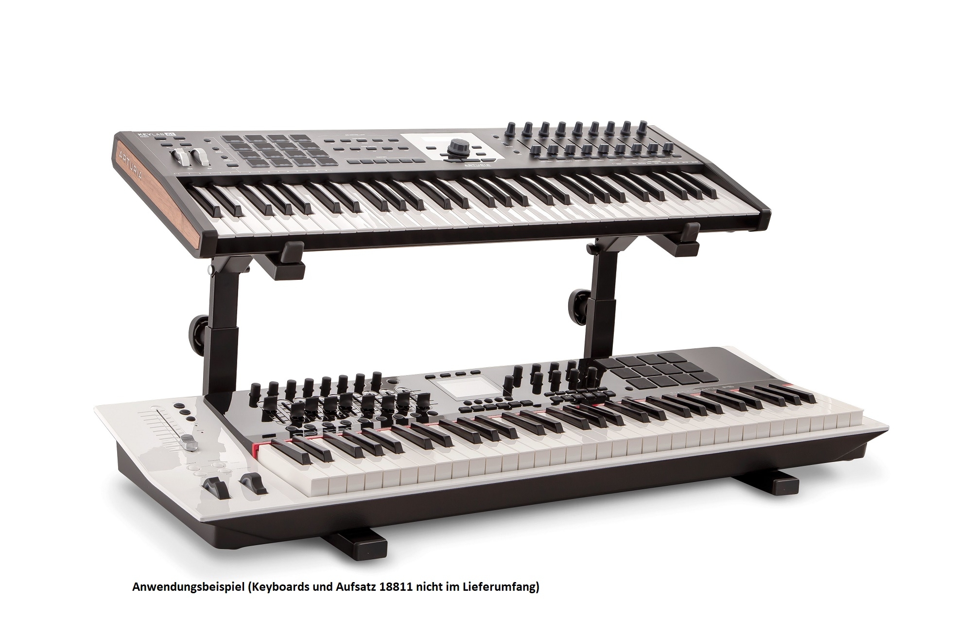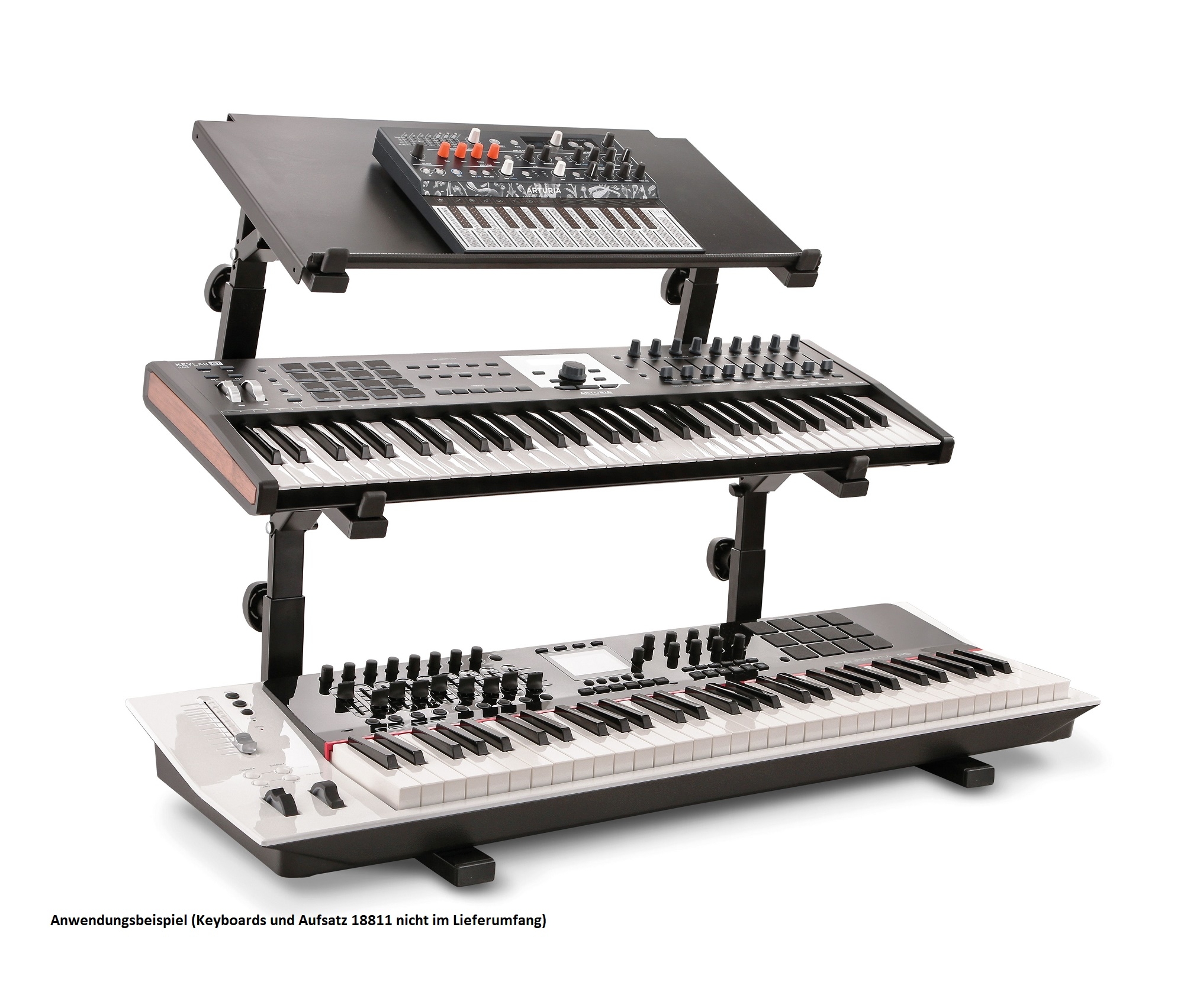 (NUR IN VERBINDUNG MIT DEM AUFSATZ 18811) Mit Hilfe dieses Grundträgers kann der Aufsatz 18811 im Handumdrehen zu einem kompletten Keyboard-Tischstativ umfunktioniert werden. Die Breite des somit komplettierten Tischstativs kann in fünf Schritten von 526 bis 770 mm eingestellt werden. Die oberen Auflagearme des Aufsatzes können außerdem in der Tiefe in 4 Positionen verstellt werden, so dass das Blickfeld auf das untere Keyboard frei liegt. Der Aufsatz 18811 lässt sich zudem in der Höhe und in der Neigung ganz flexibel verstellen. Als Auflage für kleineres elektronisches Equipment ist die Ablage 18819 optional erhältlich. Selbstklebende Auflagegummis verhindern ein Verkratzen oder Verrutschen der Instrumente. Das Tischstativ kann auf Wunsch mit dem Aufsatz 18822 für eine dritte Ebene erweitert werden.Anmelden