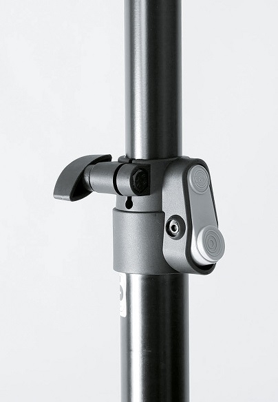 2 x K&M Boxenstativ in einer Tragetasche; formschöner Klemmhebel; patentierte stufenweise Höhenverstellung; inklusive Adapterhülse 21326