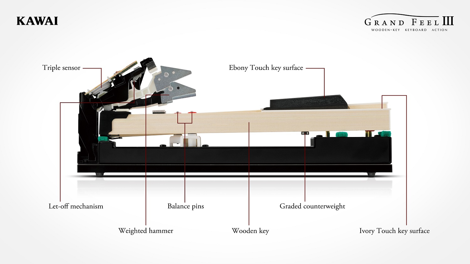 Alle 88 Tasten der Grand Feel III Tastatur sind mit elfenbeinartigen Belägen ausgestattet (Ebony&Ivory Touch), die dem Spieler durch eine griffige Oberfläche mehr Sicherheit und eine exzellente Spielkontrolle ermöglichen.