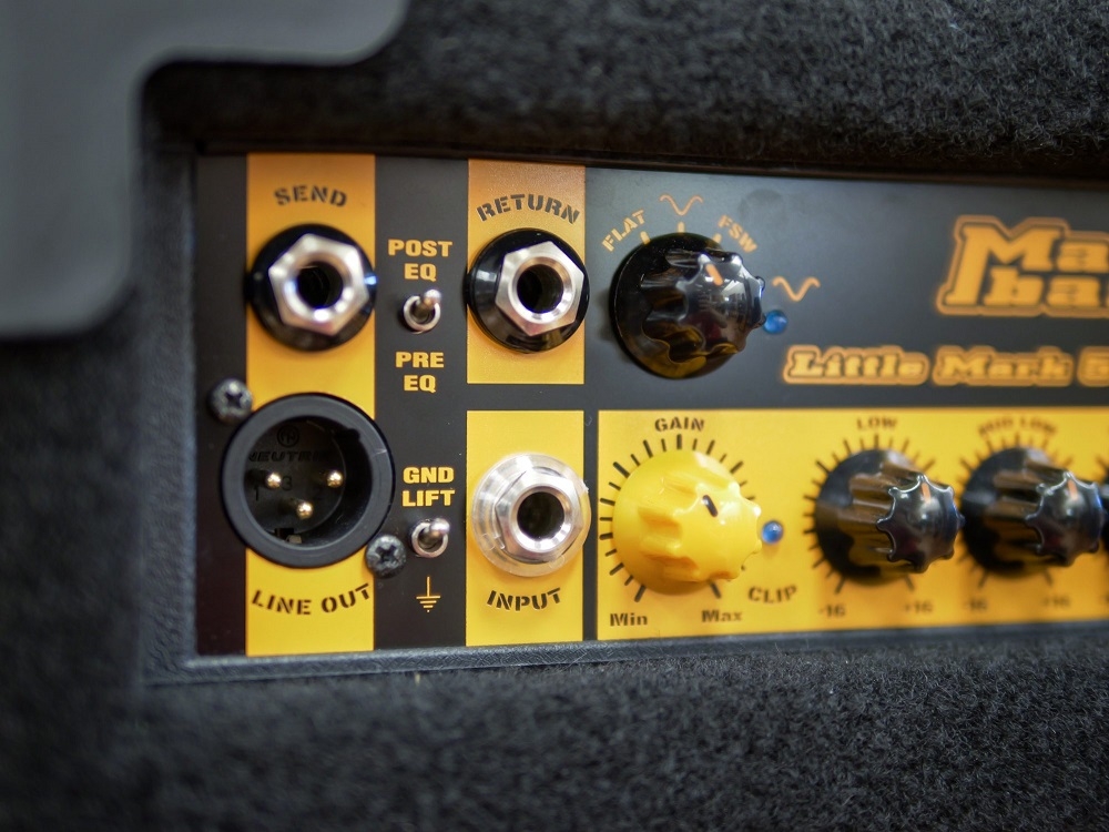 Master, Gain, Low, Mid Low, Mid high, High, Old School, Line Out, Pre/Post EQ Switch & Ground Lift (Rückseite)