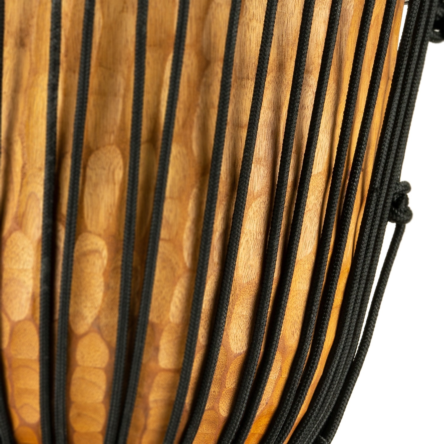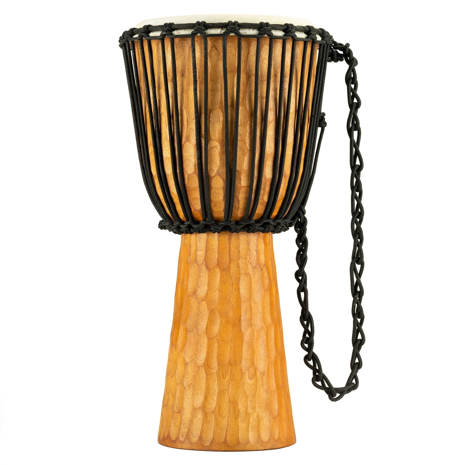 Die wunderschönen, handgeschnitzten Kessel haben eine geriffelte Oberfläche, die an sonnengetränktes Wasser erinnert.Diese Textur sieht nicht nur gut aus, sondern sorgt auch dafür, dass die Djembe leicht zwischen den Knien gehalten werden kann.