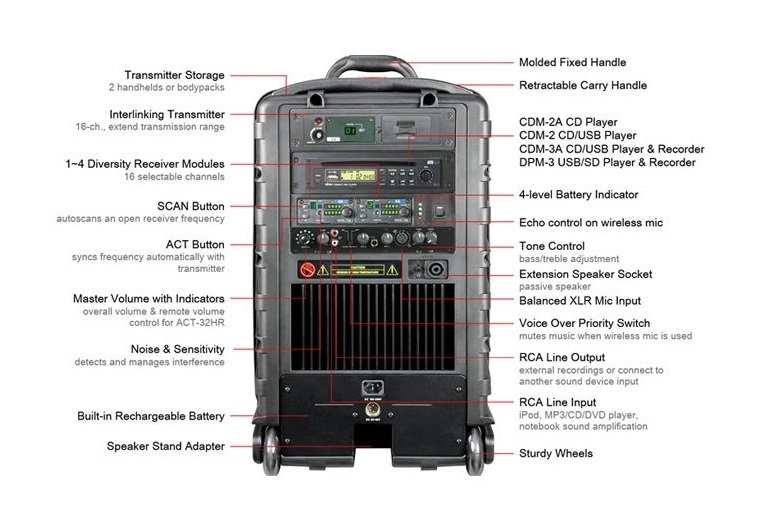 Akkubetriebenes Mobiles Beschallungssystem mit CD-Player und FunkmikrofonDie MA-808 ist das Flaggschiff unter den mobilen Beschallungssystem von Mipro. Mit unschlagbaren 250 Watt spielt es bei den ganz großen Lautsprecheranlagen mit. Mit einem 2-Wege-Sytem überzeugt es mit perfektem Klang bei Musik-, Gesangs- und Sprachanwendungen und bietet genügend Lautstärke für große Veranstaltungen in großen Veranstaltungshallen sowie auch im Freien auf großen Plätzen etc. Mit wahlweise einem modularem MP3-Player (USB/SD-Karte) oder CD/USB-Player inklusive Fernbedienung, Bluetooth-Schnittstelle und bis zu 6 anschließbaren Mikrofonen (4 x drahtlos modulare Empfänger; 2 x drahtgebunden) ist das MA-808 für jeden Auftritt gewappnet. Durch den Einsatz eines Sendemoduls kann das Audiosignal an beliebig viele zusätzliche Empfänger gesendet werden. Aufgrund von zwei leistungsstarken 12 V Akkus ist eine zuverlässige kabellose Stromversorgung und eine lange Betriebszeit garantiert.