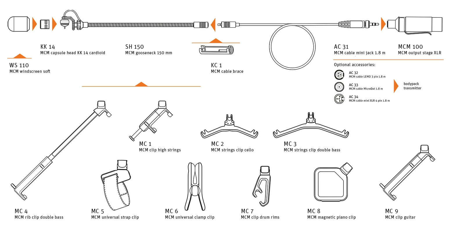Das Miniature Clip Mic MCM System legt die Messlatte für Eletretmikrofone hoch. Nach typischer Neumann-Manier bildet das System den charakteristischen Sound akustischer Instrumente in Live-Anwendungen perfekt ab. Dabei definiert es neue Standards, etwa für natürlichen Klang, Handlichkeit, verlässliche Befestigung und Langlebigkeit. Zum System gehören neun instrumentenspezifische Befestigungsclips für eine Vielzahl akustischer Instrumente. Der modulare Gesamtaufbau erlaubt den leichten Austausch einzelner Komponenten und garantiert einen außergewöhnlich attraktiven "Return on Investment". Die Kapsel: Perfektion in acht TeilenEin neues Niveau klanglicher Ausgewogenheit, eine natürlicherer Bass- und Mittenbereich sowie tranparente Höhen: Die neu entwickelte KK 14 mit Nierencharakteristik lässt bisherige Einschränkungen des Elektret-Prinzips hinter sich und bildet den charakteristischen Klang akustischer Instrumente vollständig ab. Neumann hat dazu ein einzigartiges, schichtbasiertes Design entwickelt. Dabei wurden alle Komponentem für optimale Leistung konzipiert, werden einzeln gefertigt und anschließend von Hand montiert. Die strenge Qualitätskontrolle garantiert ein bislang unerreichtes Maß an klanglicher Konsistenz: Jede Kapsel klingt exakt gleich und liefert einen typisch neutralen Neumann-Sound. Das spart Zeit beim Setup und Soundcheck, denn Fertigungstoleranzen müssen jetzt nicht mehr per EQ ausgeglichen werden.