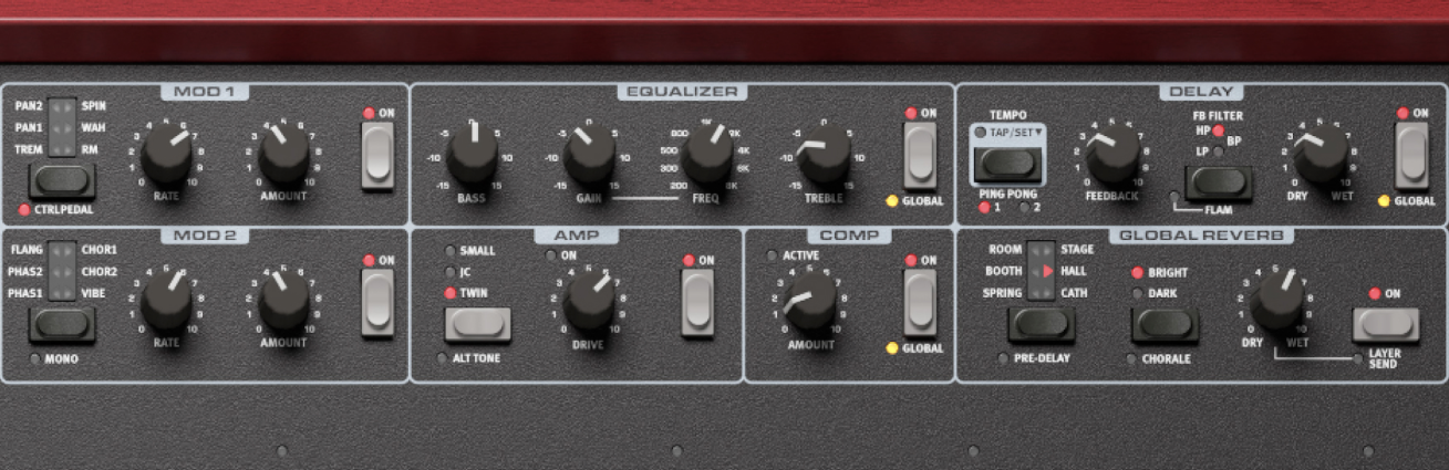 Der Nord Grand 2 verfügt über eine leistungsstarke neue Effektsektion pro Layer. Die umfangreiche Auswahl an Effekten umfasst brandneue Typen von Reverb-, Delay-, Amp- und Modulationseffekten.