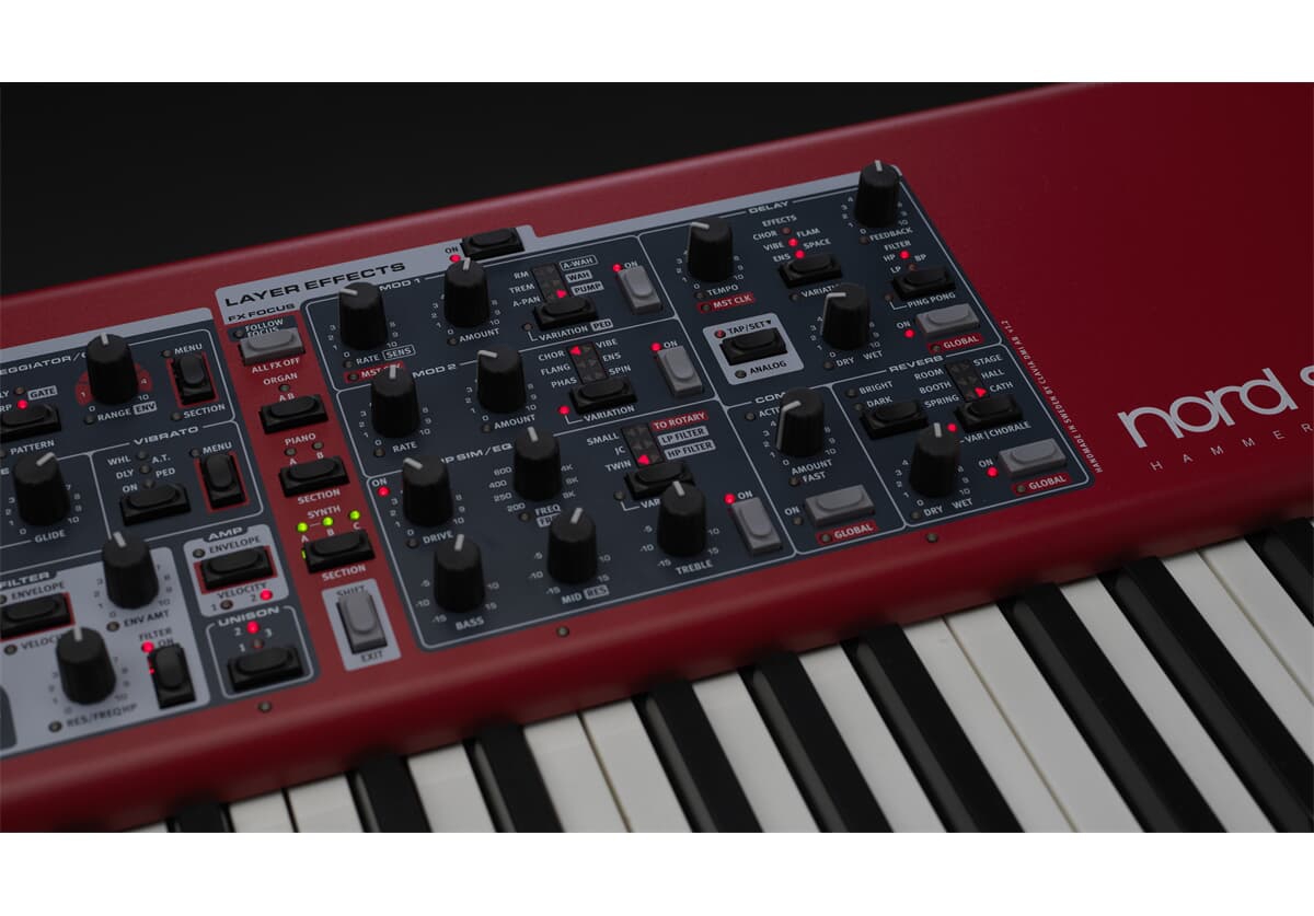 Das Nord Stage 4 kommt mit einer neuen, erweiterten Sammlung von Flügeln, Uprights und Electric Pianos aus Nords exklusiver Piano Library, kombiniert mit neuen Features wie Dynamic Compression und Unison.