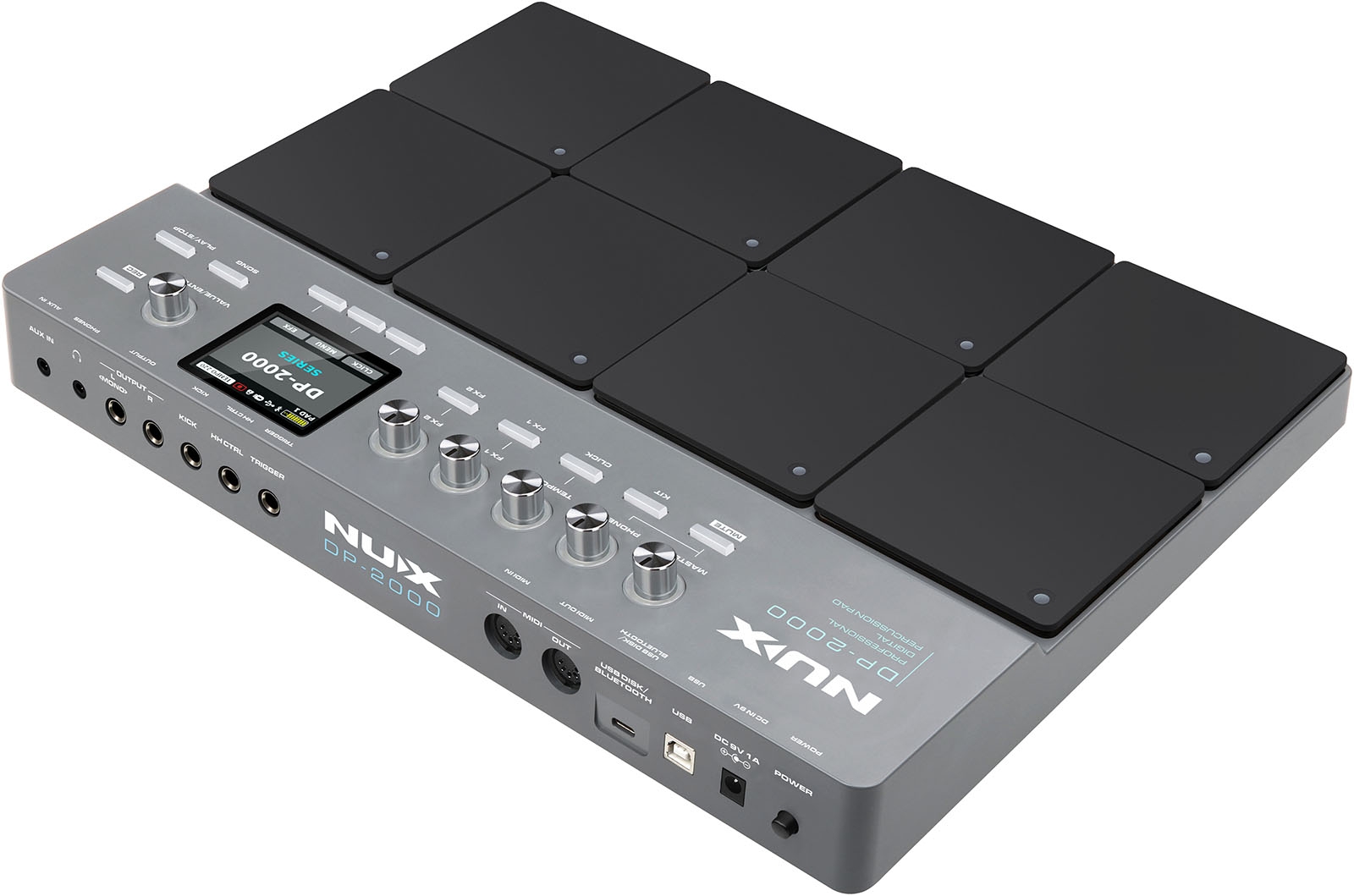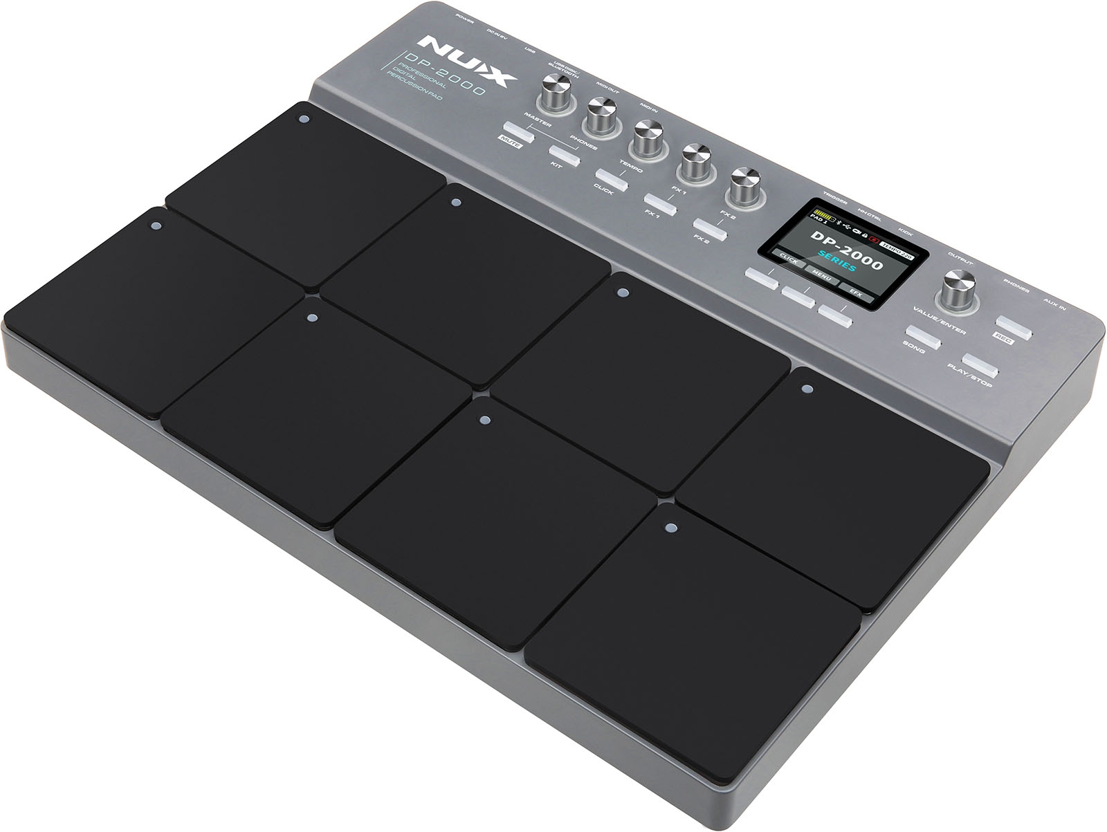 Das brandneue NUX DP-2000 ist ein leistungsstarkes integriertes Percussion-Pad.Es verfügt über 8 unabhängige, anschlagdynamische Schlagflächen und 20 vorprogrammierte Kits, darunter die hochwertigen akustischen Schlagzeugsamples aus dem Flaggschiff DM-8 sowie Folk-Percussion-Sounds und elektronische Soundsamples.