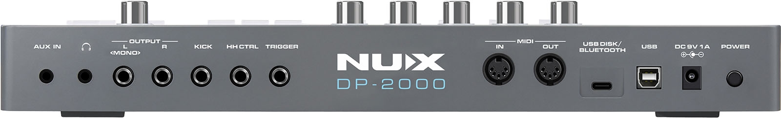 AUX IN, PHONES, OUTPUT, KICK, HH CTRL, TRIGGER IN, MIDI IN/OUT, USB DISK/BLUETOOTH MODULE, USB, DC IN 9V