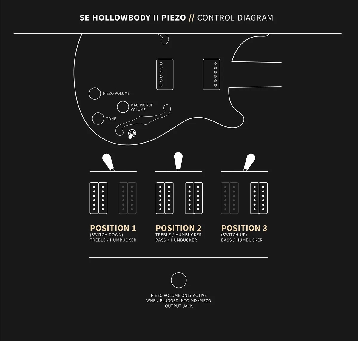Semiakustische E-Gitarre mit Piezo Tonabnehmer.Der SE-Hollow II Piezo kombiniert den ausgewogenen, klaren, resonanten Ton einer Semiakustischen Gitarre mit der Power einer E-Gitarre mit massivem Korpus. Ahornboden und Ahorndecke wird hier mit Mahagonizargen kombiniert. Die 58/15 "S"-Tonabnehmer liefern Klarheit und Ausgewogenheit, die groß und musikalisch klingen. Die SE Hollowbody II Piezo ist jetzt mit einem neu entworfenen LR Baggs/PRS Piezo-System ausgestattet und bietet Musikern die Vielseitigkeit, sowohl akustische als auch elektrische Töne mit einem Instrument zu spielen. Das Instrument ist mit zwei Lautstärkereglern (magnetisch und piezoelektrisch) und Ausgangsbuchsen (Mix/Piezo und magnetisch) ausgestattet. Die Gitarre kann über die "Mix/Piezo"-Buchse angeschlossen werden um die einzelnen Lautstärkeregler zu verwenden und um die 58/15 "S"-Tonabnehmer mit den akustischen Tönen des Piezos zu mischen. Alternativ kann die Gitarre über die Buchsen auch separat anschlossen werden, so dass der magnetische Tonabnehmer in einen Verstärker und der Piezo durch einen akustischen Verstärker oder über DI geleitet werden kann. Wenn die magnetische Ausgangsbuchse alleine verwendet wird, wird die Piezobatterie vollständig überbrückt, was als Ausfallsicherung dient (in diesem Szenario funktionieren die magnetischen Tonabnehmer auch dann noch, wenn der Piezobatterie der Saft ausgegangen ist). Dies ist das vielseitigste SE-Instrument in der fast zwanzigjährigen Geschichte der Serie!