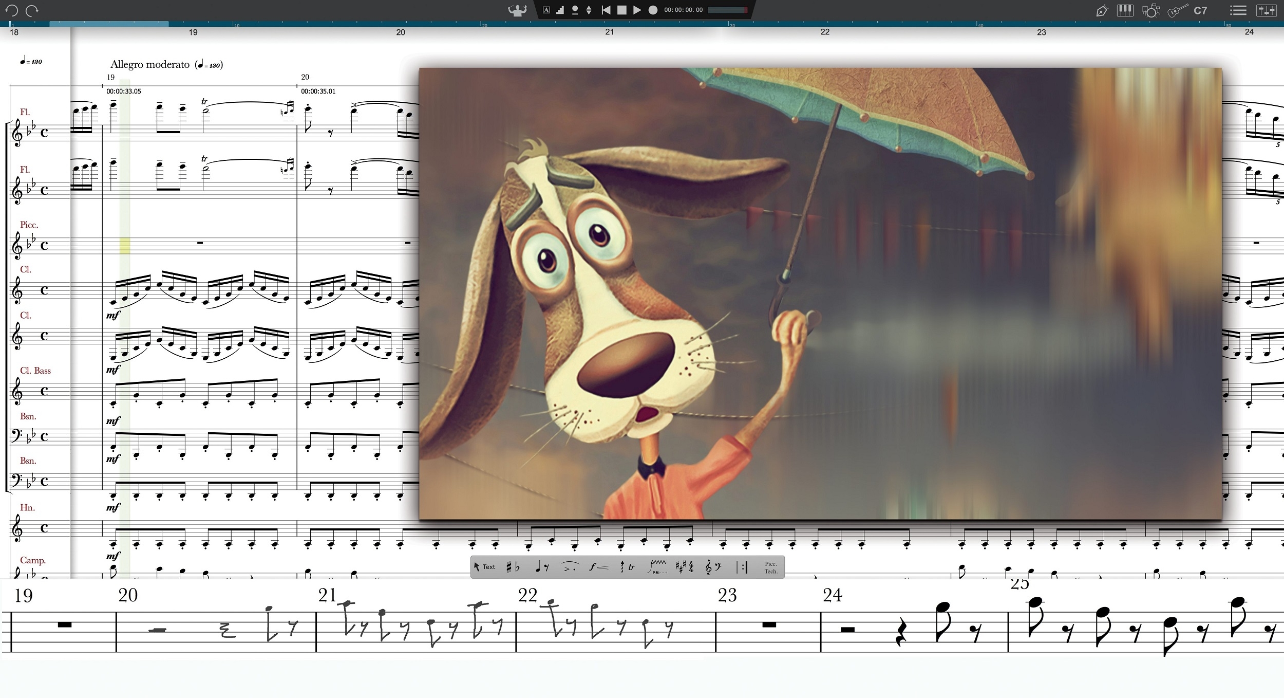 Komponieren direkt zum Bild, Formate MP4, H.264, MPEG, MOV, AVI, M4V und 3GP unter MacOS und Windows sowie WMV unter Windows.