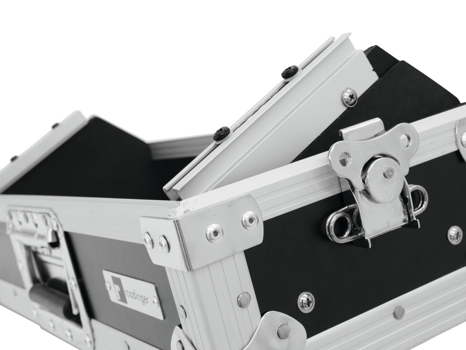 Flightcase für 483-mm-Geräte (19")Mit dem ROADINGER Mixer-Case Profi sind Ihre Geräte, zum Beispiel Controller oder Mischpulte, immer gut aufbewahrt. Die schräg gestellten Profilschienen, die um ca. 13° geneigt sind, sorgen für eine optimale Bedienbarkeit des Gerätes von oben.