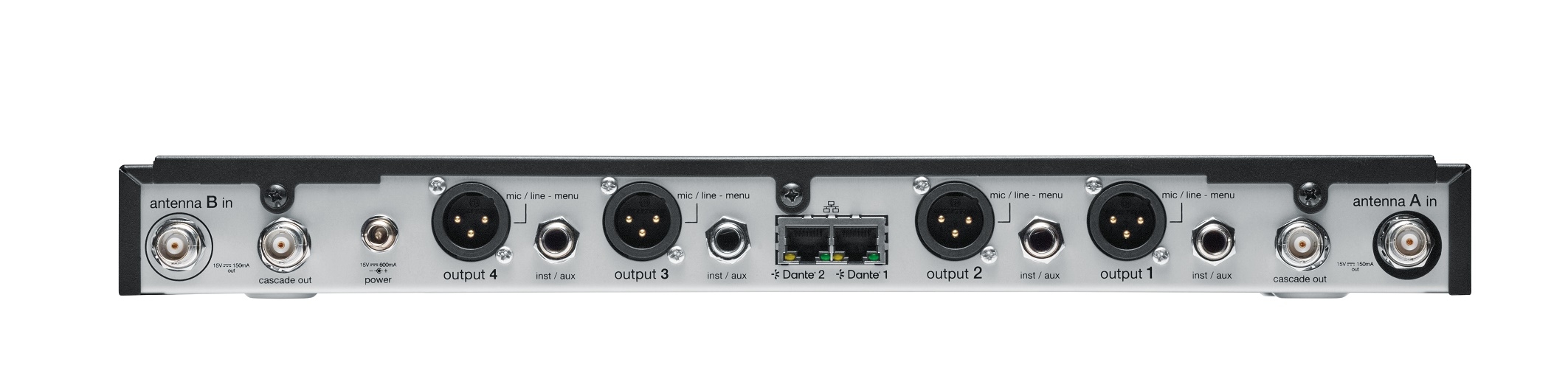 SLXD4Q+ G65 Dante, digitaler 4-Kanal Breitband Empfänger im 19" Gehäuse, 24 bit/48 kHz Samplerate, 120 dB Dynamikumfang, 2 getrennte Kontrolleinheiten für Kanal 1+2 und 3+4, 4-stufige Autosummierung, mic/line level schaltbar, 4x XLR und 6,3mm Klinke Ausgänge, BNC in und out zur Kaskadierung von bis zu zwei Einheiten, 2x Dante RJ45 Anschlüsse, Frequenzband G65 (470-606 MHz), inkl. Rackmount, Antennenzubehör, 2x 1/4 Lamda Antennen, PS60E Netzteil, NetzwerkkabelAnmelden
