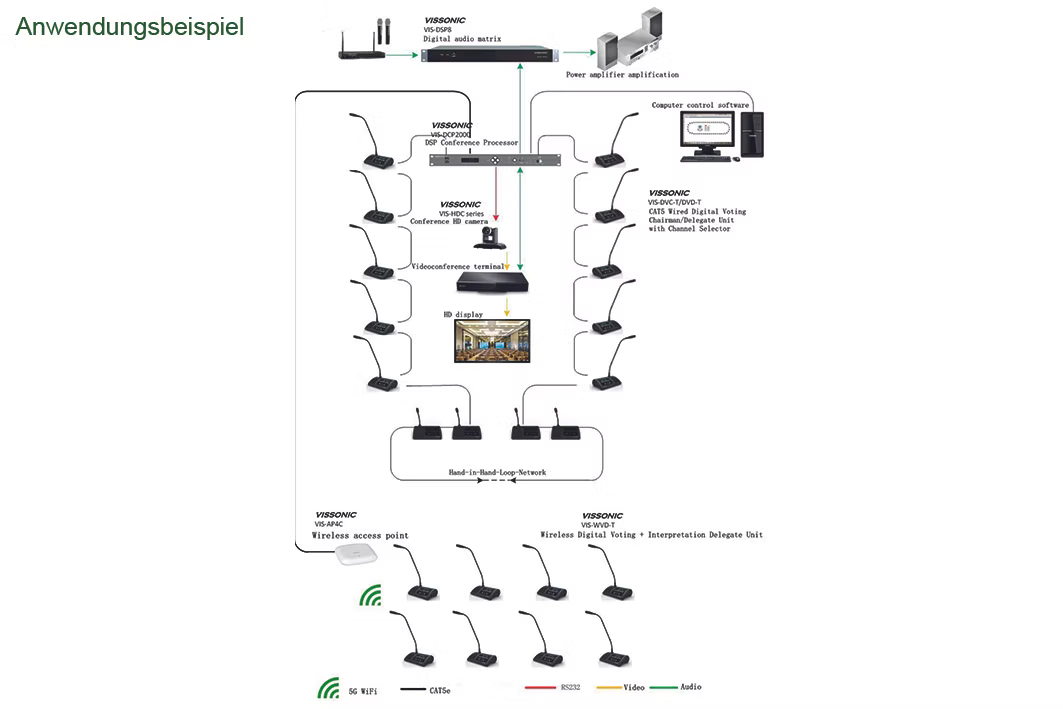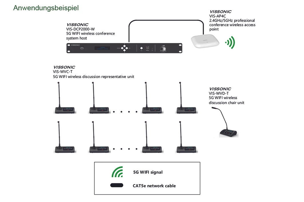 - Bis zu 4 Access-Points können gleichzeitig betrieben werden. Dadurch lassen sich auch sehr große Konferenzen realisieren.