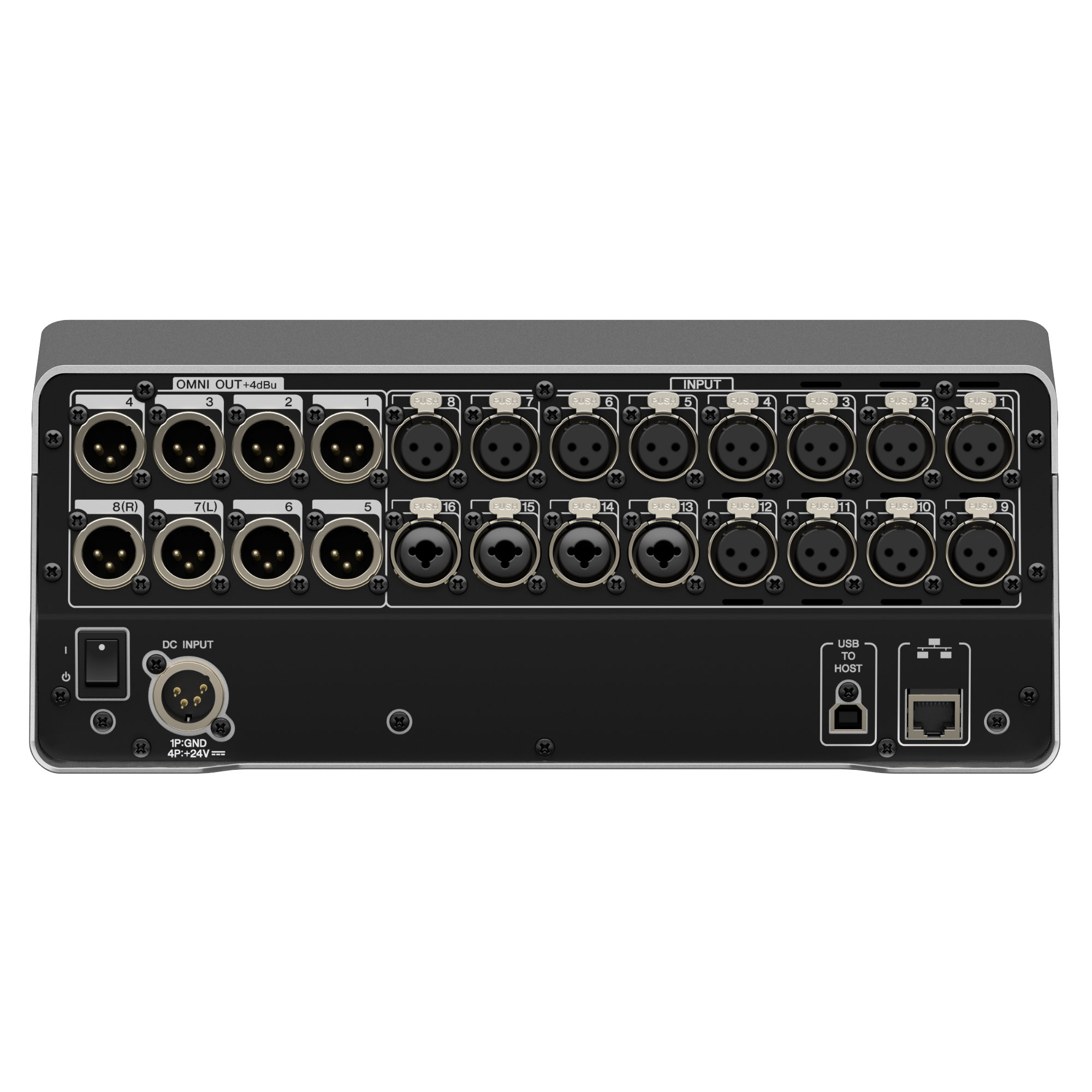 - Lokale I/O: 16 Mic/Line (12 XLR + 4 XLR/TRS Phones Combo) Eingänge und 8 (XLR) Ausgänge