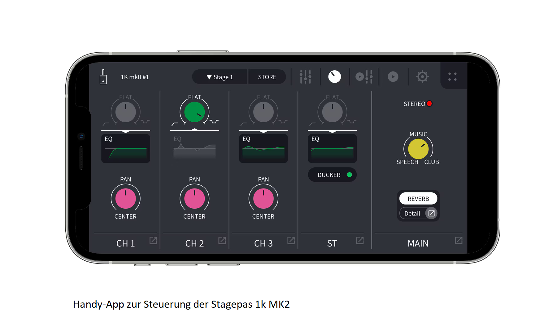 4 Band PEQ pro Kanal über Fernbedienungs APP STAEGPAS Controller Hi-Z-Instrumenteneingänge für Instrumente mit hoher Impedanz (z.B. E-Gitarren)