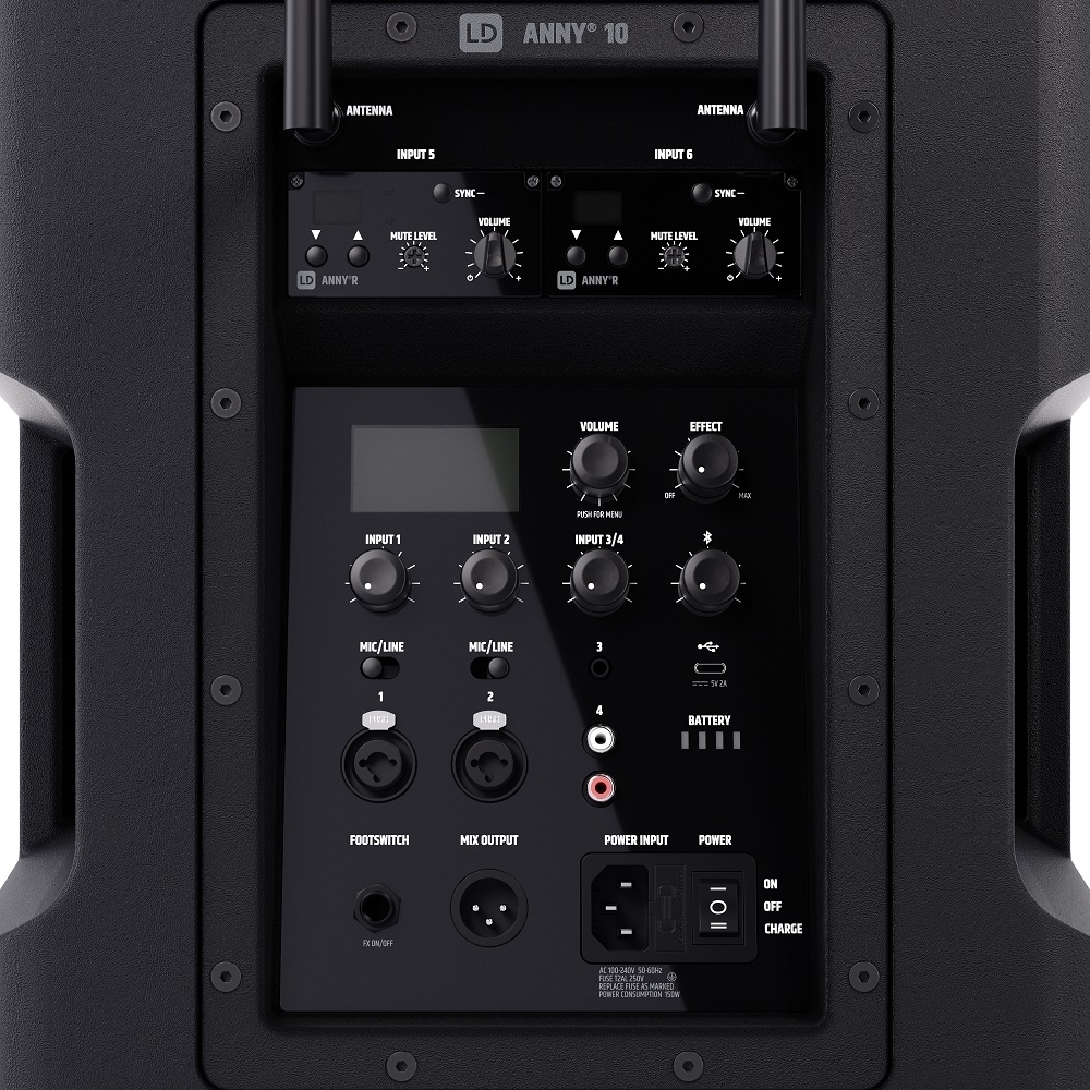 Mit integriertem 6-Kanal-Mixer, 3-Band-EQ, 5 Anwendungs-Presets (MUSIC, LIVE, VOCAL, ECO, FLAT) und Effekten wie Reverb & Delay vereint sie eine umfangreiche Ausstattung und Spitzenklang in einem kompakten und robusten Design. ANNY 10 beeindruckt mit ihren vielfältigen Anschlussmöglichkeiten: zwei Mikrofon-/Line-Kombi-Eingänge, einen Stereo-Kanal mit 3,5mm Klinke (AUX) und Cinch-Inputs sowie Bluetooth 5.0 mit AAC-Codec.